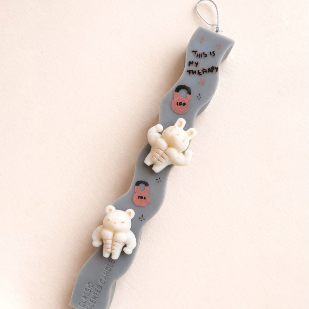 Λαμπάδα με 3d γυμναστηριακά αρκουδάκια σε άρωμα Wood & Spice από 100% φυτικό κερί για ασφαλή καύση.