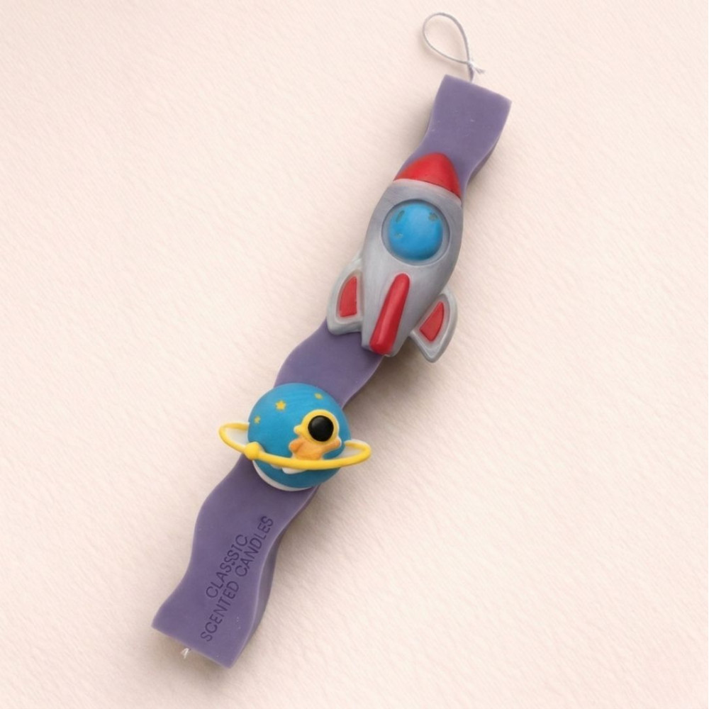 Λαμπάδα με 3d διαστημόπλοιο και πλανήτη, σε άρωμα τσουρέκι από 100% φυτικό κερί για ασφαλή καύση.