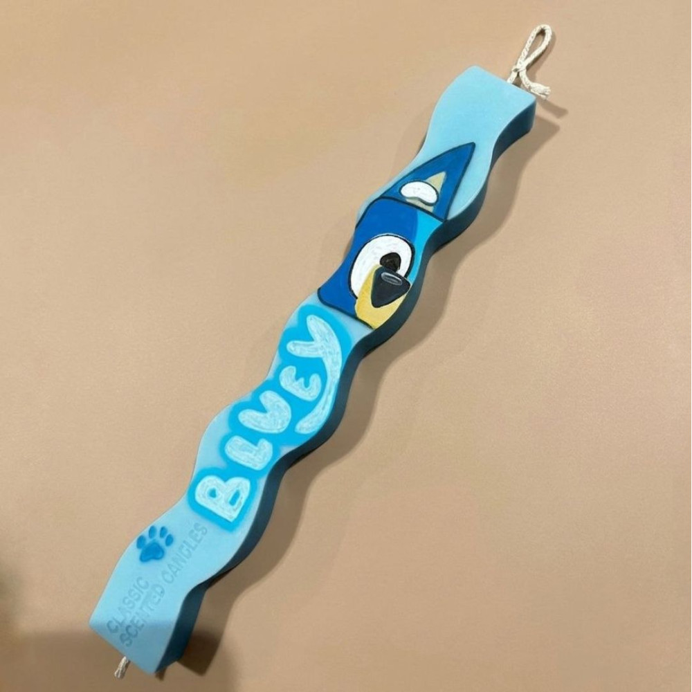 Λαμπάδα ζωγραφισμένη με τους χαρακτήρες Bluey & Bingo σε άρωμα Τσουρέκι από 100% φυτικό κερί για ασφαλή καύση.